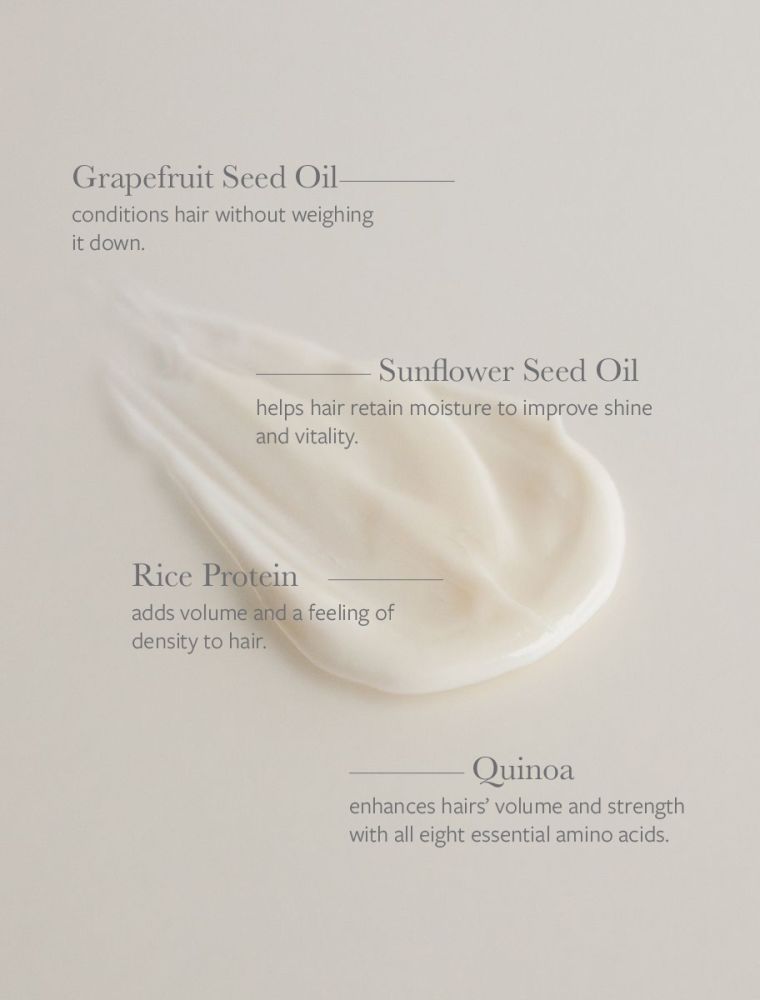 Our vegan Volume Conditioner, with organic grapefruit seed oil, is formulated to add volume to fine or thin hair types without the use of harsh chemicals or silicones. Rice proteins help enhance shape and body, while tapioca starch helps remove sebum which can weigh down hair. With a 100% natural, invigorating garden mint and vanilla, your volumized hair will thank you!