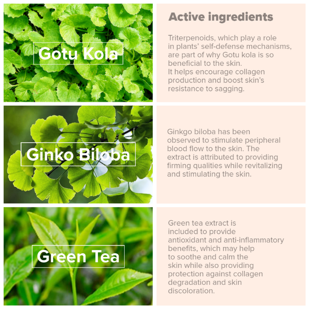 Organic Aloe Barbadensis (Microfarmed Aloe Vera Leaf) Juice, Glycerin (Vegetable), Organic Centella Asiatica (Gotu Kola) Extract, Organic Ginko Biloba Leaf Extract, Organic Camelia Sinensis (Green Tea) Leaf Extract, Cetearyl Alcohol, Organic Sodium Stearoyl Lactylate, Myristyl Myristate, Caprylic Capric Triglycerides (Organic Coconut Oil), Cucurbita Pepo (Pumpkin) Seedcake, Organic Populus Tremuloides (Aspen) Bark Extract, Panthenol (Pro-Vitamin B5), Organic Glyceryl Stearate, Vaccinium Myrtillus (Bilberry) Extract, Organic Persea Americanaï (Avocado) Fruit Oil, Macadamia Ternifolia (Macadamia) Nut Oil, Hyaluronic Acid (Organic Plant Sources), Hydrolyzed Avena Sativa (Oat) Flour, Saccharum officinarum (Organic Sugar Cane) Extract, Allantoin (Organic Comfrey Root), Organic Citrus Aurantium Dulcis (Orange) Fruit Extract, Citrus Limonum (Lemon) Extract, Camellia Japonica Oil, Aleurites Moluccana (Kukui) Nut Oil, Ribes Nigrum (Black Currant) Seed Oil, Acer Saccharum (Sugar Maple) Extract, Organic Squalane (Olive), Borago officinalis Seed Oil, Rubus Idaeus (Red Raspberry) Seed Oil, Vitamin E (Mixed Tocotrienols).
