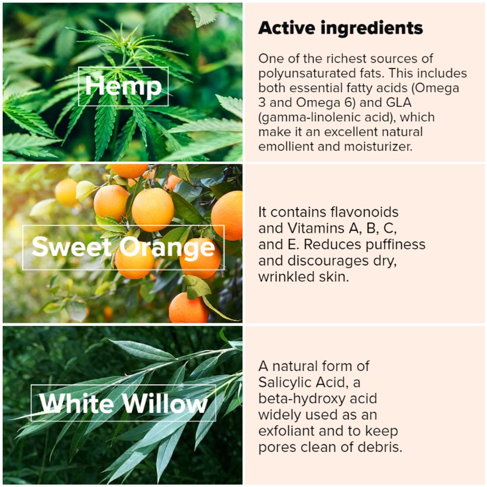 Organic Aloe Gel, Sodium Cocoamphoacetate (Organic Coconut Oil), Alkyl Polyglucosides (Corn Starch), Hemp Seed Oil, Cocamidopropyl Betaine (Organic Coconut Oil), Sodium Chloride, Organic Vegetable Glycerin, Organic Chamomilla Recutita (Matricaria) Flower Extract (Chamomile), Organic Salix Alba (White Willow) Bark Extract, Organic Citrus Aurantium Dulcis (Orange) Fruit Extract, Gluconodelta-lactone (and) Sodium Benzoate-ECOCERT certified.